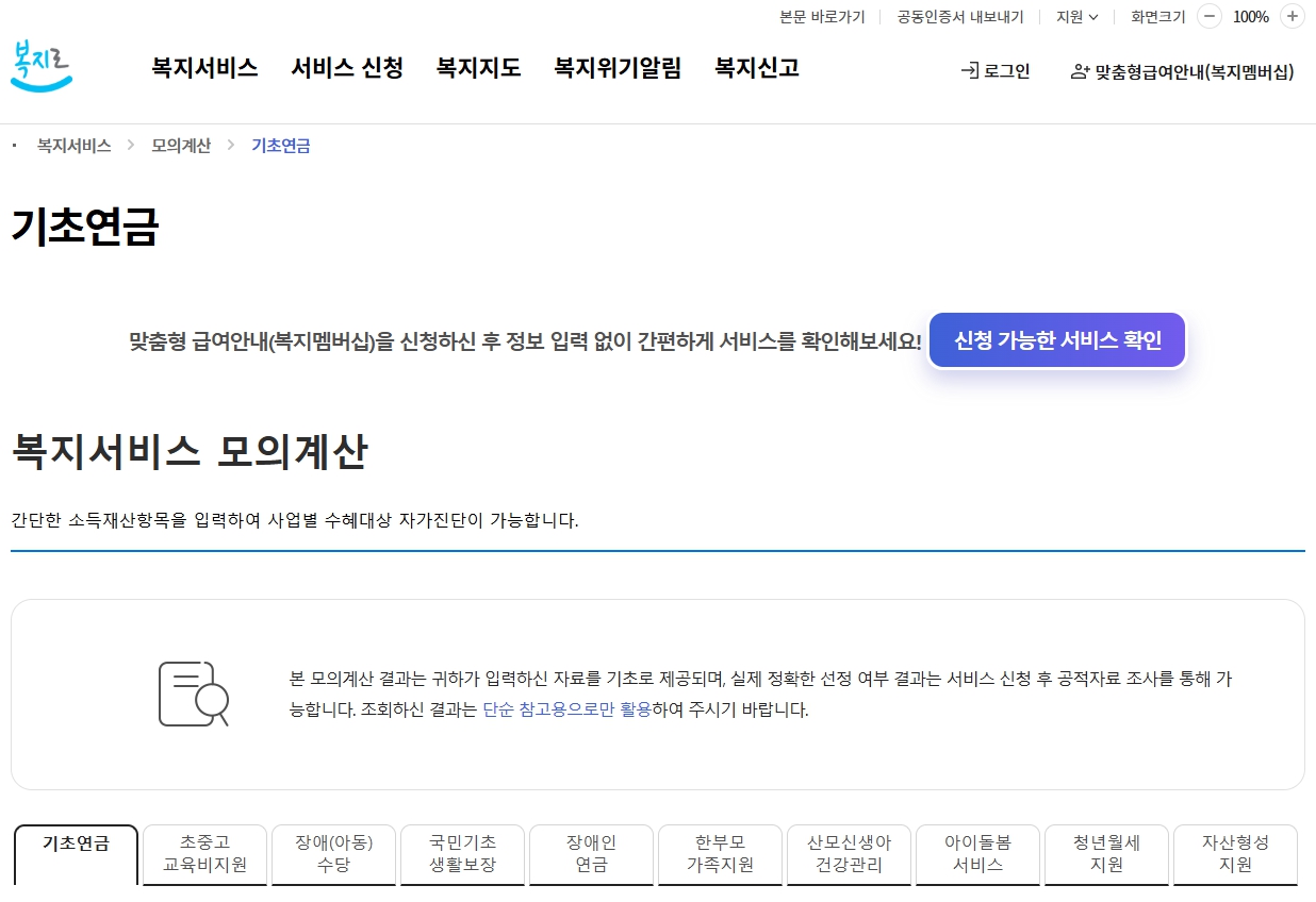 기초연금 신청 전에 기초연금 수급자격이 되는지 확인해보고 싶다면, 정부에서 제공하는 모의계산기를 이용해보세요.